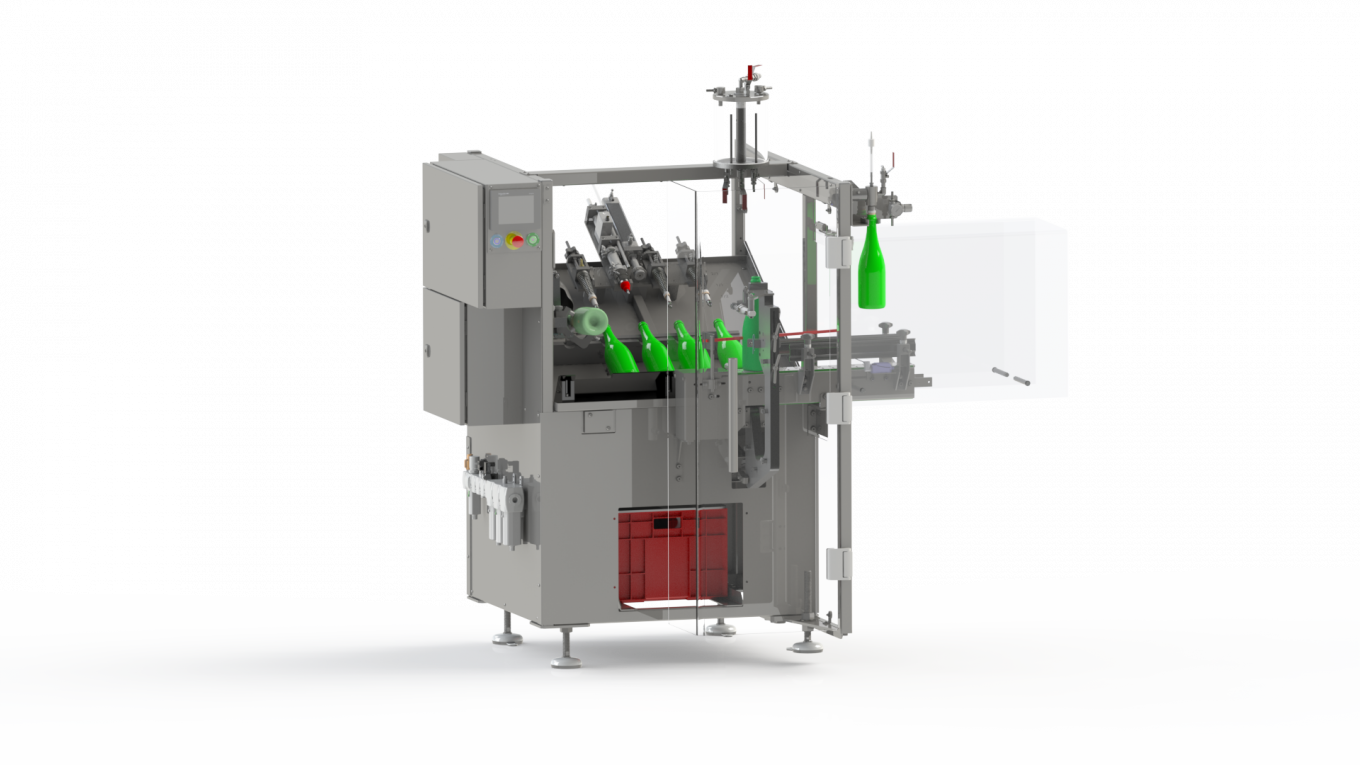 Entrée manuelle de la bouteille et sortie automatique sur convoyeur.